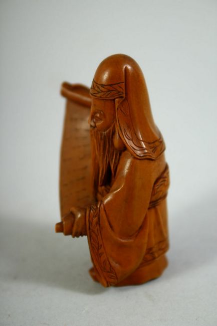 A SMALL JAPANESE CARVED WOOD FIGURE of a sage holding a scroll, 6cm high.