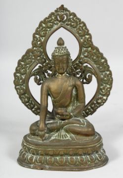 AN 18TH/19TH CENTURY TIBETAN OR NEPALESE BUDDHA, the reverse with traces of gilding, with detachable halo, overall 22.5cm high.