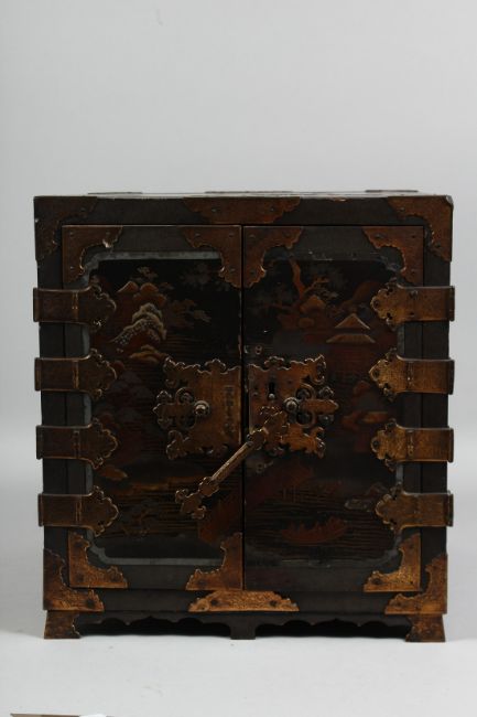 A JAPANESE MEIJI PERIOD BLACK LACQUER TABLE CABINET, the doors opening to reveal seven lacquered drawers, the cabinet with gilt decoration depicting landscapes and flora, with brass fittings including two handles, 30.5cm high, 28cm wide, 30cm deep.