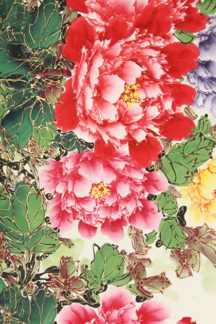 A CHINESE SCROLL PAINTING depicting large flower heads, inscribed and with red seal mark. 130cm x 63cm