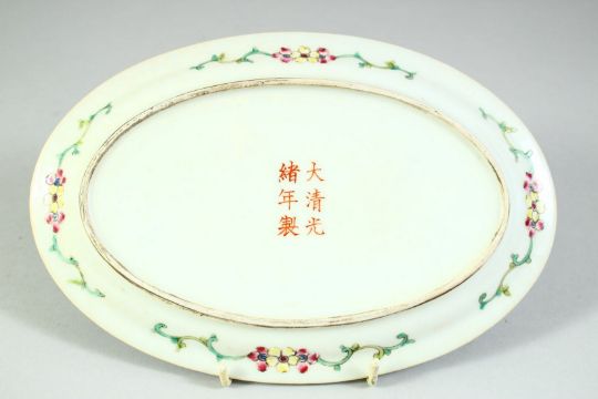 A SMALL CHINESE FAMILLE ROSE OVAL SHAPE PORCELAIN DISH, painted with birds and native flora, six character mark in red to base, 20.5cm x 14cm.