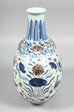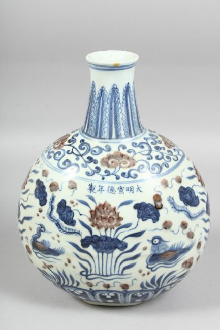 A CHINESE BLUE, WHITE, AND UNDERGLAZE RED PORCELAIN MOON FLASK, decorated with lotus and ducks, bearing six-character mark to the side. 30cm high