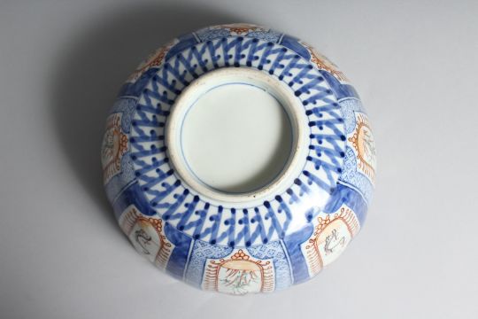A JAPANESE IMARI PORCELAIN BLUE AND WHITE BOWL, with fluted-form, and decorated with panels of native flora. 25cm diameter
