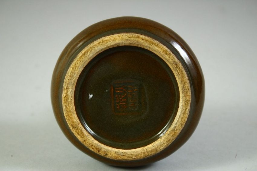 A CHINESE OLIVE GREEN GLAZE VASE, with impressed mark to base, 13.5cm high.