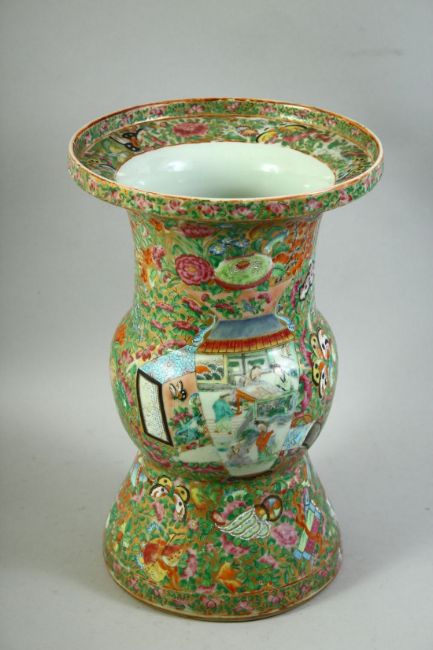 A LARGE CHINESE CANTON PORCELAIN VASE, painted with two vases depicting scenes with figures and decorated all over with flora, butterflies and precious objects, 40cm high.