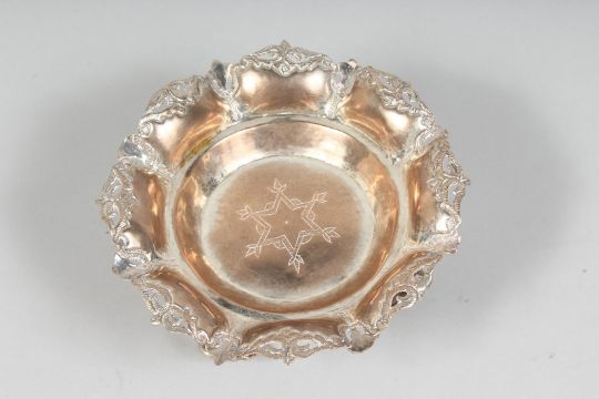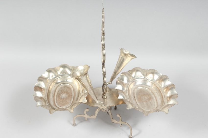 AN IRAQI WHITE METAL CENTREPIECE, 35cm long, together with a similar footed dish, (2).