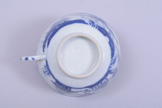 A CHINESE BLUE AND WHITE PORCELAIN TEACUP, the exterior painted with landscape scene with buildings and a lake, 9.5cm diameter.