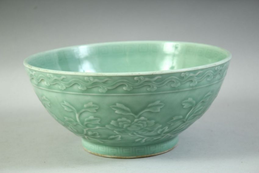 A LARGE CHINESE CELADON GLAZE PORCELAIN BOWL, with floral decoration, the inner rim with greek key border, with six character mark to base, 27cm diameter.
