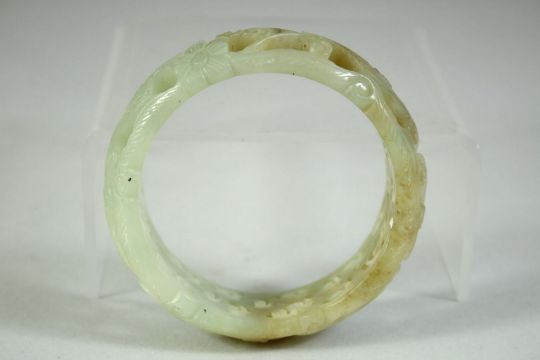 A CHINESE CARVED AND PIERCED JADE BRACELET, 8cm diameter.