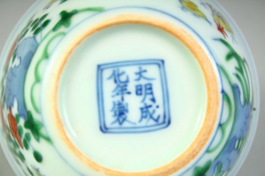 A CHINESE PORCELAIN CHICKEN CUP, the base with six character mark, 8cm diameter.