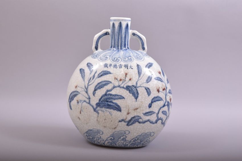 A CHINESE MING STYLE BLUE AND WHITE AND UNDER GLAZED RED TWIN HANDLE MOONFLASK VASE, decorated with fruit blossom above a band of waves, six character mark below neck, 27.5cm high.