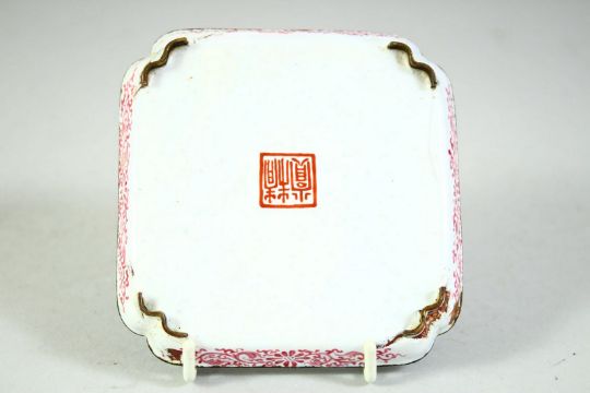 A CHINESE SQUARE FORM ENAMELLED DISH, painted with two female figures in a garden, 10cm sqaure.
