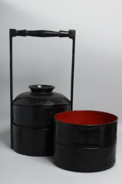 A CHINESE BLACK LACQUERED FOOD CARRIER, containing three detachable trays and lid, overall 44cm high.