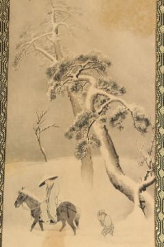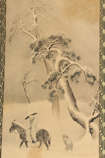 TWO CHINESE PAINTINGS ON SILK depicting birds and flora, each inscribed and with red seal mark, together with another square painting of a river scene, together with a picture of a figure on horseback in a snowy landscape. Various sizes. (4)