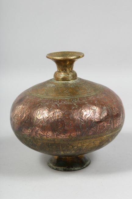 A FINE 18TH CENTURY SOUTH INDIAN CHASED COPPER AND BRASS LOTA, with engraved figural decoration, 17cm high.