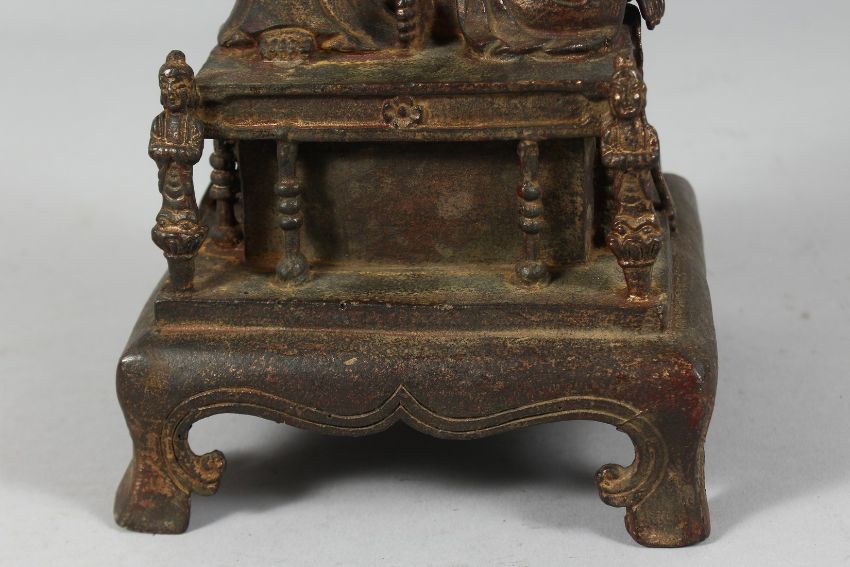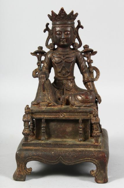 A GOOD SEATED BRONZE DEITY, raised on a plinth, supported by four legs. 24cm high