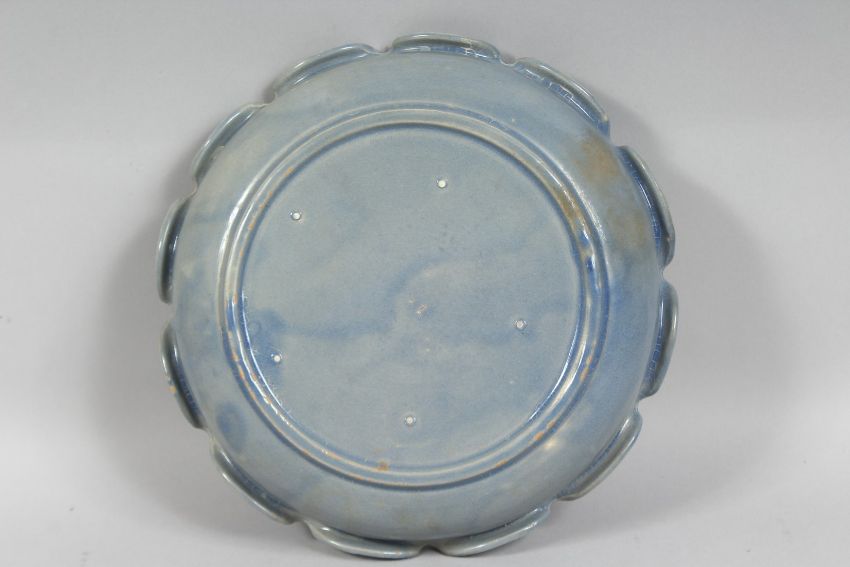 A LARGE CHINESE BLUE GLAZED POTTERY BOWL with petal-form rim, the centre with relief decoration of erotic scenes. 24.5cm diameter
