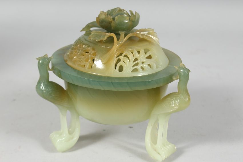 A GOOD CHINESE CARVED AND PIERCED JADE TRIPOD CENSER AND COVER, the cover with pierced foliate decoration and large flower finial, the legs carved as peacocks. 13.5cm high (with cover)
