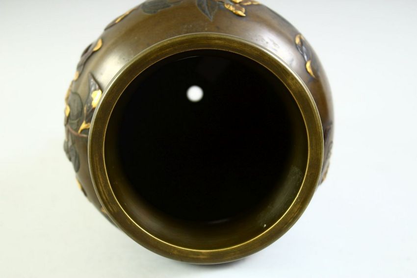 A FINE JAPANESE MEIJI PERIOD BRONZE AND MIXED METAL VASE, beautifully decorated with applied metals depicting a bird amongst native flora and further embellished with gilt highlights, vase signed, 30cm high.