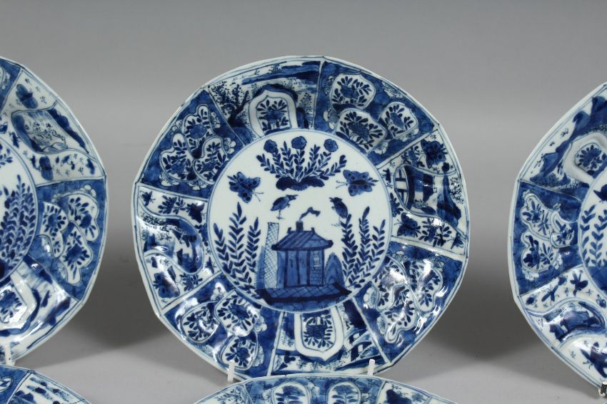 A SET OF EIGHT 18TH CENTURY CHINESE BLUE AND WHITE PORCELAIN DISHES, the centre depicting a cottage with a smoking chimney and further decorated with birds, butterflies and floral motifs, with a mark to the base, each 20.5cm diameter, (8).