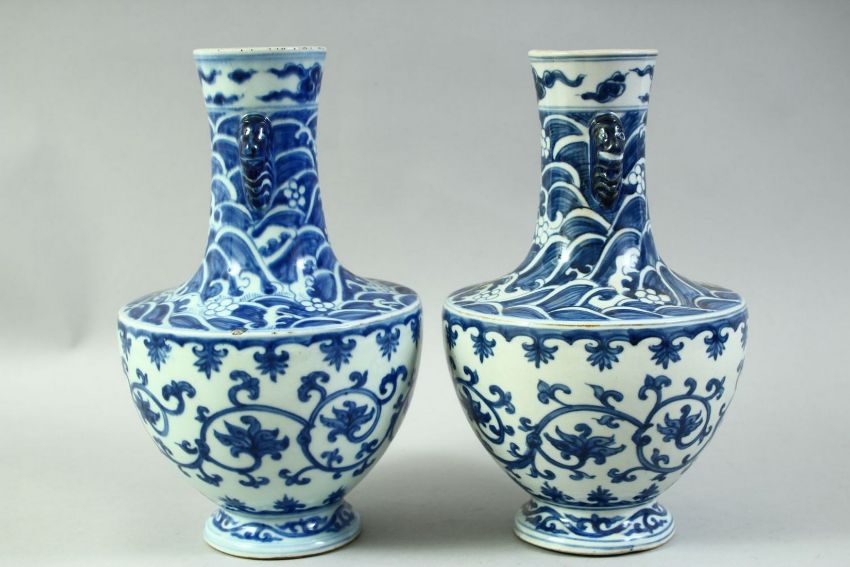 AN UNUSUAL PAIR OF CHINESE BLUE AND WHITE PORCELAIN VASES, the neck and shoulders decorated with stylised waves and flowers, the body of each with foliate decoration, 26.5cm high.