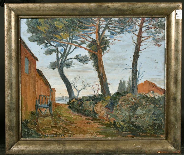 Parmentier, Circa 1932, French, a landscape from outside a cottage, oil on panel, signed, 18" x 21.5" (46 x 54cm).