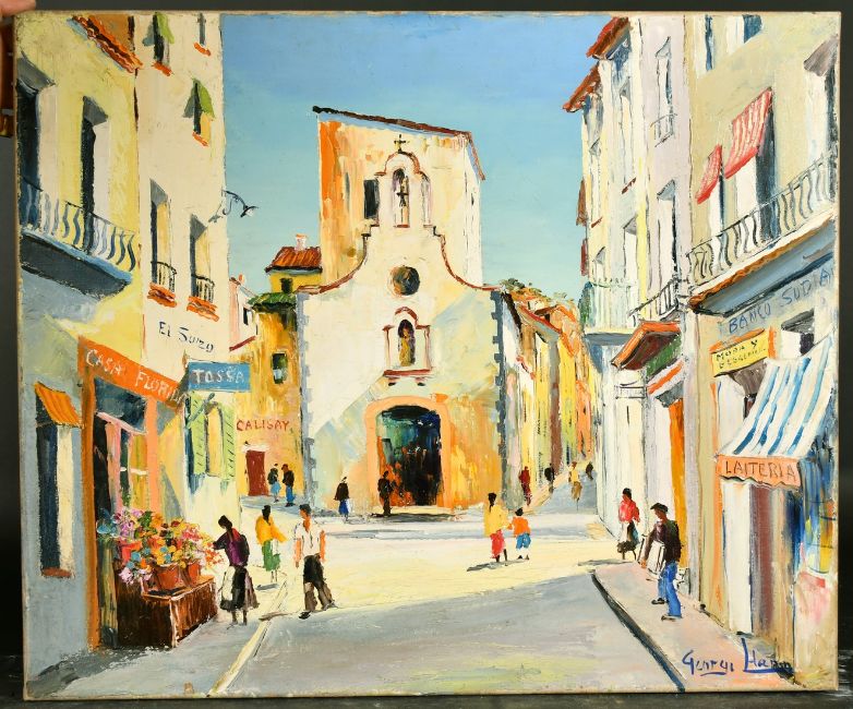 George Hann (1900-1979) 'Tossa de Mar, Spain', a street scene with figures, oil on canvas signed, 20" x 24", (unframed).