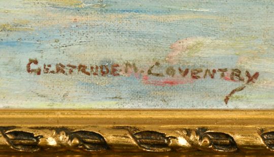 Gertrude Mary Coventry (1886-1964) Scottish, A coastal scene with boats and figures beyond, oil on canvas laid down, signed, 11.5" x 13.5".