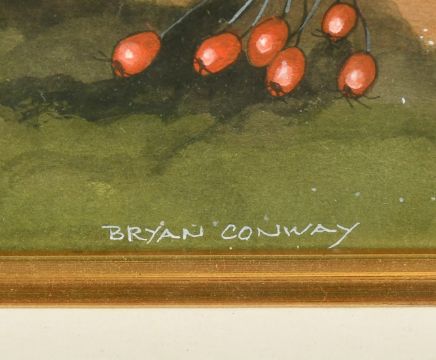 Bryan Conway (20th Century) British, 'Autumn', a hedgehog amongst seasonal foliage with a pheasant flying beyond, watercolour, signed, 20.5" x 13.5".