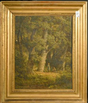 19th century French School, figures gathering items in a woodland glade, oil on canvas, indistinctly signed, 16.5" x 12.25" (42 x 31cm).