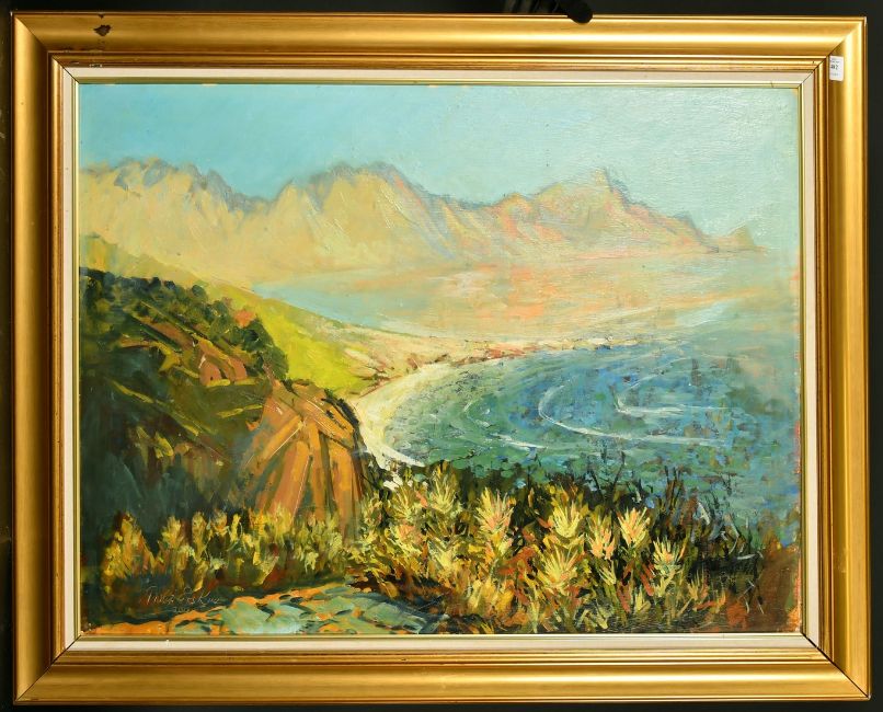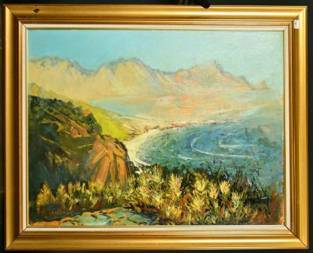 Philip Niel Erskine (1933-2013) South African, A view of a bay with mountains beyond, oil on board, signed, 30" x 39".