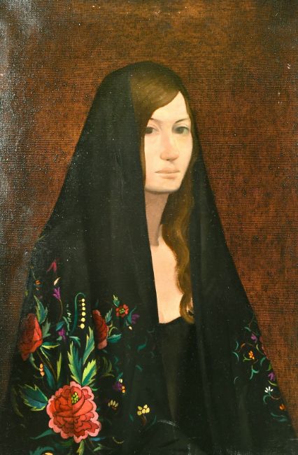 20th Century, 'Jane in black shawl', oil on canvas, inscribed verso and dated August 1968, 36" x 24", (unframed).