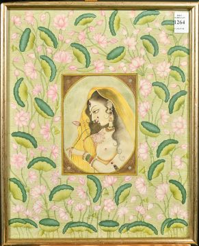 An Indian miniature painting, of a female holding a flower, the border with painted floral decoration, 13.25" x 10.5".