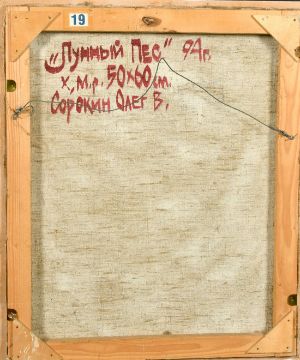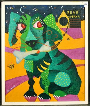 20th Century Russian School, A colourful dog with a bone, oil on canvas, inscription verso, signed in Cyrillic, 25.75" x 19.75".
