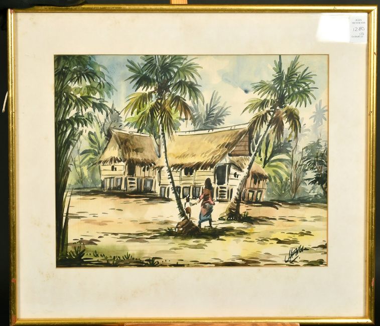 South East Asian School, Junks at Sea, watercolour, indistinctly signed, 10" x 13.5", along with another similar by the same hand of a villager by palm trees, (2).