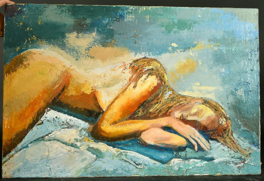 20th Century French School, a study of a resting female nude, oil on canvas, 21" x 32" (54 x 81cm), unframed.