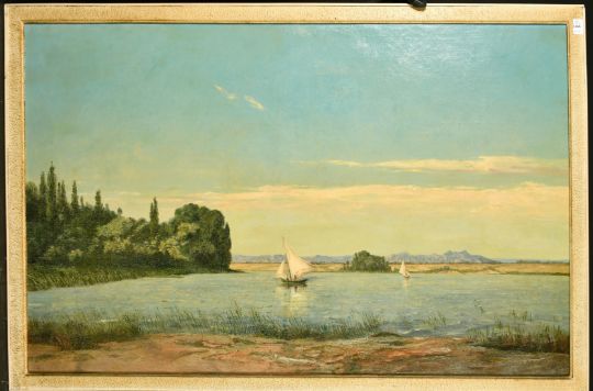 Late 19th Century, sailboats on a lake with mountains beyond, oil on canvas, 30" x 49.5".