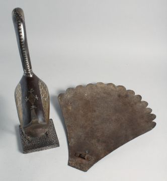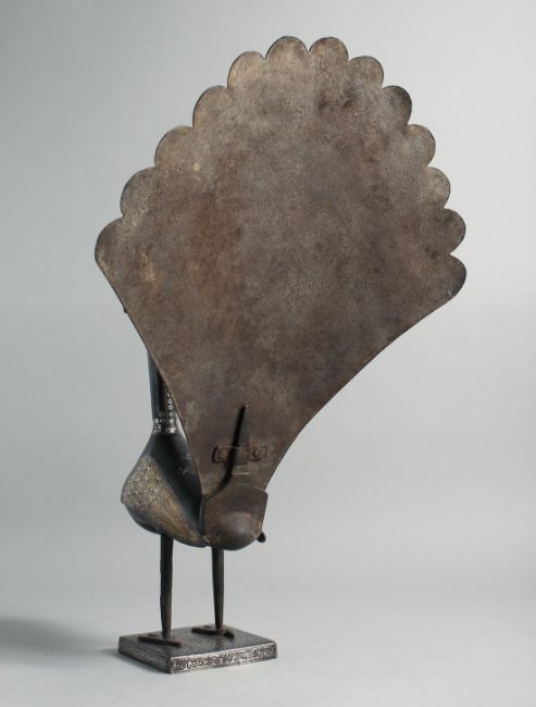 A FINE LARGE 19TH CENTURY PERSIAN QAJAR GOLD AND SILVER INLAID STEEL PEACOCK, beautifully inlaid in gold and silver with fine decorative motifs, the peacock mounted to a square form silver inlaid base and with detachable 'tail feather' steel panel, 50cm high (with tail attached), peacock 36.5cm high.