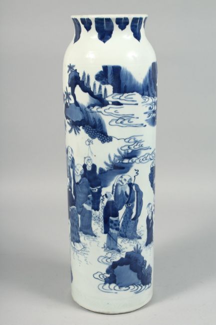 A FINE, LARGE CHINESE BLUE AND WHITE PORCELAIN SLEEVE VASE painted with various figures in a rocky outdoor setting. 46cm high