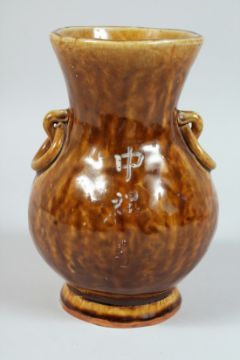 A CHINESE PART-GLAZED POTTERY VASE with relief moulded decorative panel to body and moulded drop ring handles, 18cm high.