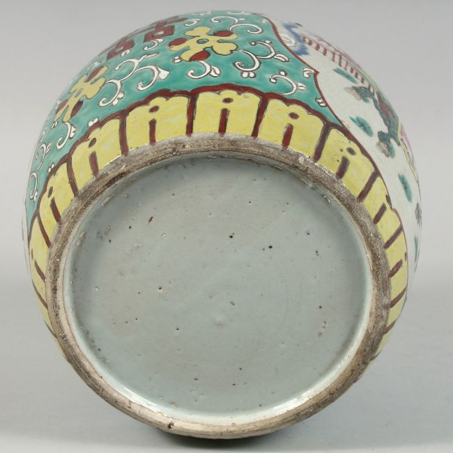 A CHINESE TURQUOISE GROUND FAMILLE ROSE PORCELAIN JAR, painted with panels of ceremonial figures, 23cm high.