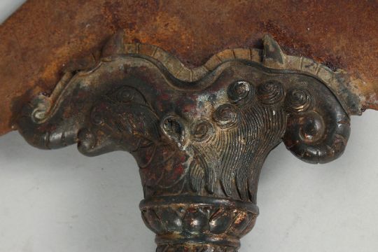 A LARGE TIBETAN BRONZE VAJRA, with traces of gilt and red paint, 33cm long.