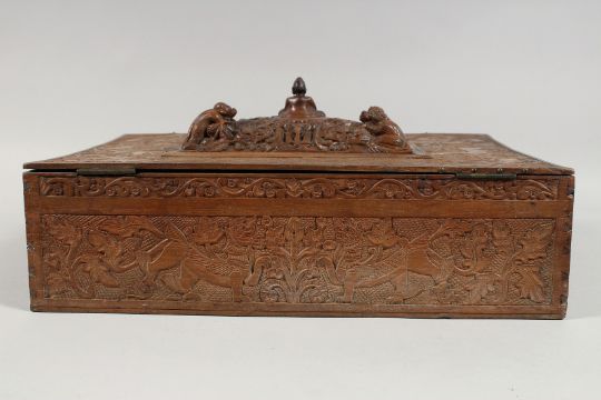 A LARGE INDIAN CARVED WOOD LIDDED BOX carved all over with various figures and beasts, the hinged lid with a carved relief of praying figures around a deity, the interior comprising five compartments, the catch with attached padlock, 42cm x 30.5cm, 12cm high.