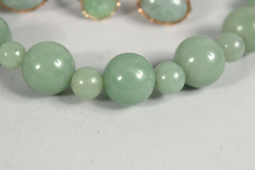 A 14CT GOLD AND JADE RING AND EARRINGS, together with a graduated jade bead necklace, (4 pieces).