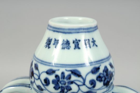 A CHINESE BLUE AND WHITE PORCELAIN TWIN-HANDLED MOON FLASK, the central decorative motif with yin-yang symbol, with six-character mark below the rim. 30cm high