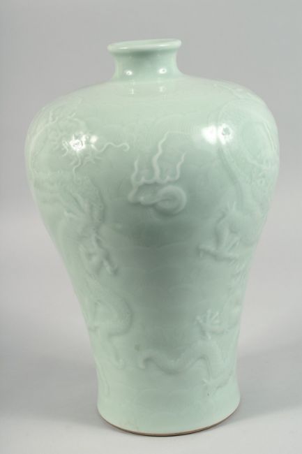 A LARGE CHINESE CELADON GLAZE MEIPING VASE with hardwood stand, the body decorated with raised dragons and the flaming pearl of wisdom on a faintly incised wave pattern background, the base with Qianlong mark, (stand with loss to one leg), vase 34.5cm high.