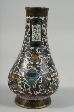A CHINESE CLOISONNE TWIN HANDLE ARROW VASE, decorated precious objects, (with fault), 19cm high.