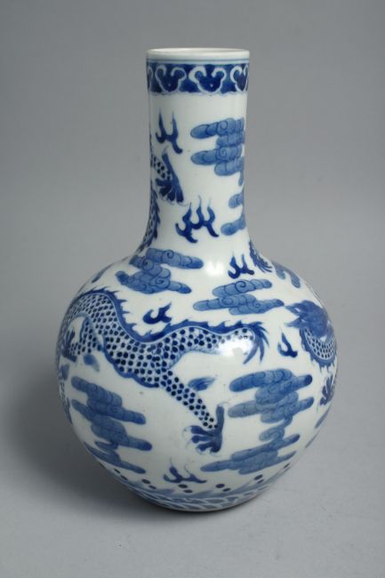 A CHINESE BLUE AND WHITE PORCELAIN BOTTLE VASE, painted with dragons and the flaming pearl of wisdom, the base with six-character mark, 22.5cm high.