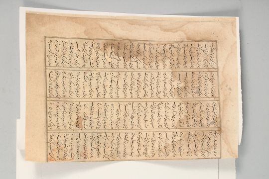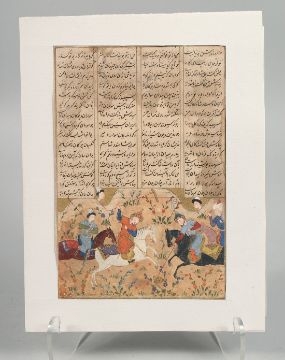 A 16TH CENTURY PERSIAN ILLUSTRATED LEAF FROM A MANUSCRIPT OF FIRDANSI'S SHAHNAMA, depicting Siyavash displaying his skill at polo before Afrasiyab, unframed, page 27cm x 18cm.