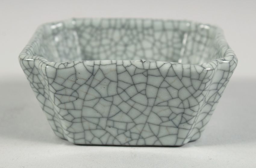 A CHINESE GE WARE BRUSH WASHER, six-character mark to base, 8cm square.